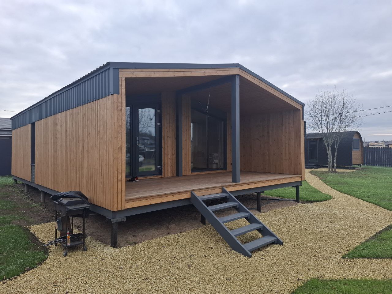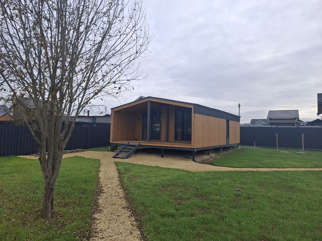 Эти фото Модульного дома отправил нам наш друг-клиент. Модульный дом от компании Пока нет Дома по проекту Барн 65 в Санкт-Петербурге произведен. Установлен модульный дом в Ленинградской области. Сделали аккуратный ландшафтный дизайн и какой красивый дом. Отдыхать в таком доме одно удовольствие!