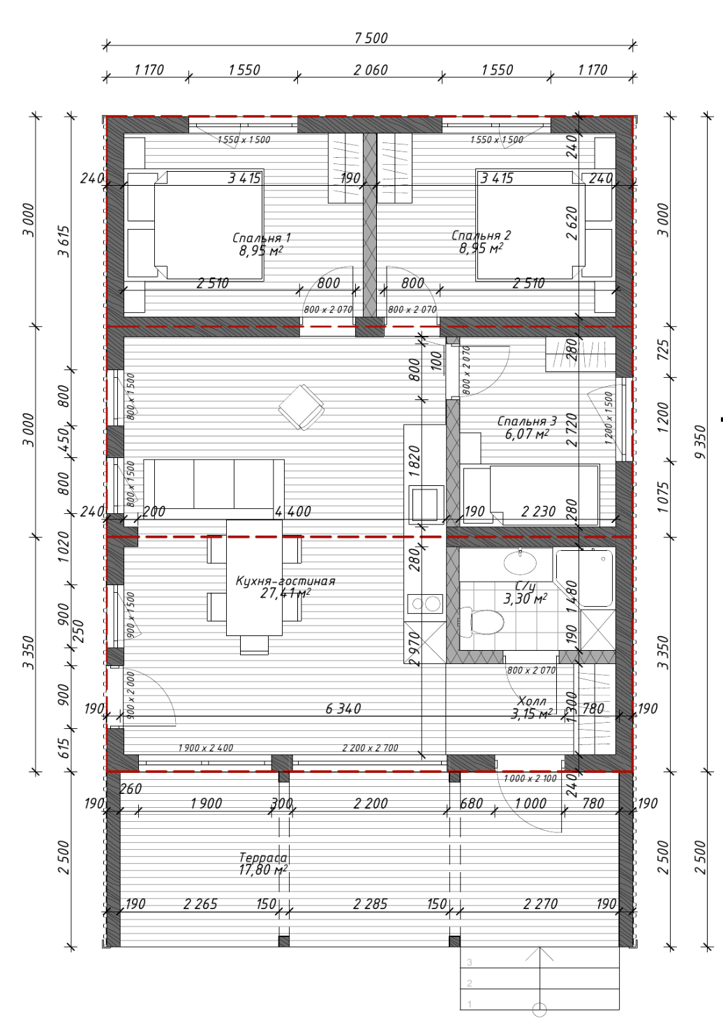 Спальные зоны позволяют удобно разместить от 4 до 6 человек, при этом сохраняется приватность для родителей и детей. Тамбур и технические помещения выполняют важную функцию в северном климате — они работают как буфер между улицей и жилым пространством, не позволяя холоду проникать внутрь.