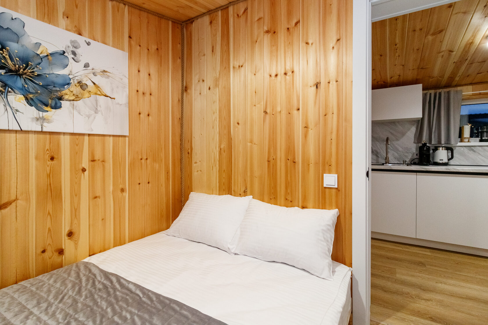 - Спальня: Уютный уголок с двуспальной кроватью, белоснежным постельным бельем и картиной на стене. Отдельная зона позволяет отдохнуть после дня на природе. В моделях под ключ мебель уже включена, так что вы заезжаете и сразу живете.