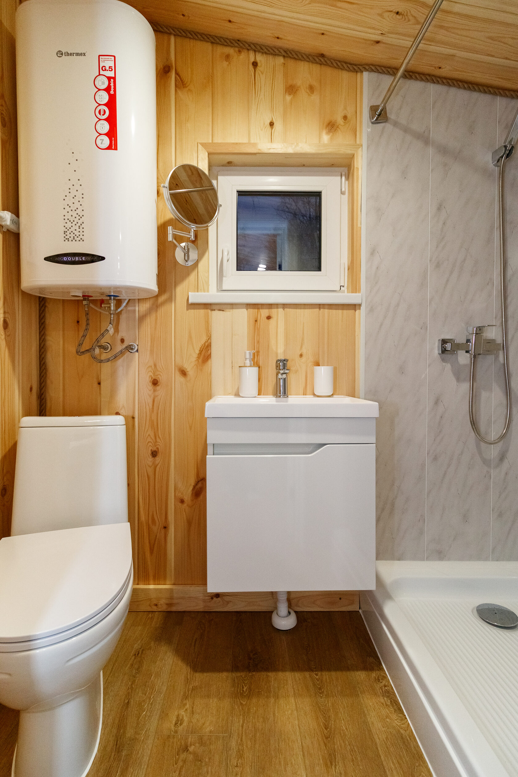 - Санузел: Компактный, но функциональный — с душем, унитазом, раковиной и водонагревателем. Мармурная плитка на стенах и деревянный пол создают атмосферу спа. В Тюмени, где вода часто жесткая, такая комплектация обеспечивает надежность и удобство. Фото демонстрирует минималистичный дизайн: белая сантехника, зеркало и достаточное освещение для утренних процедур.