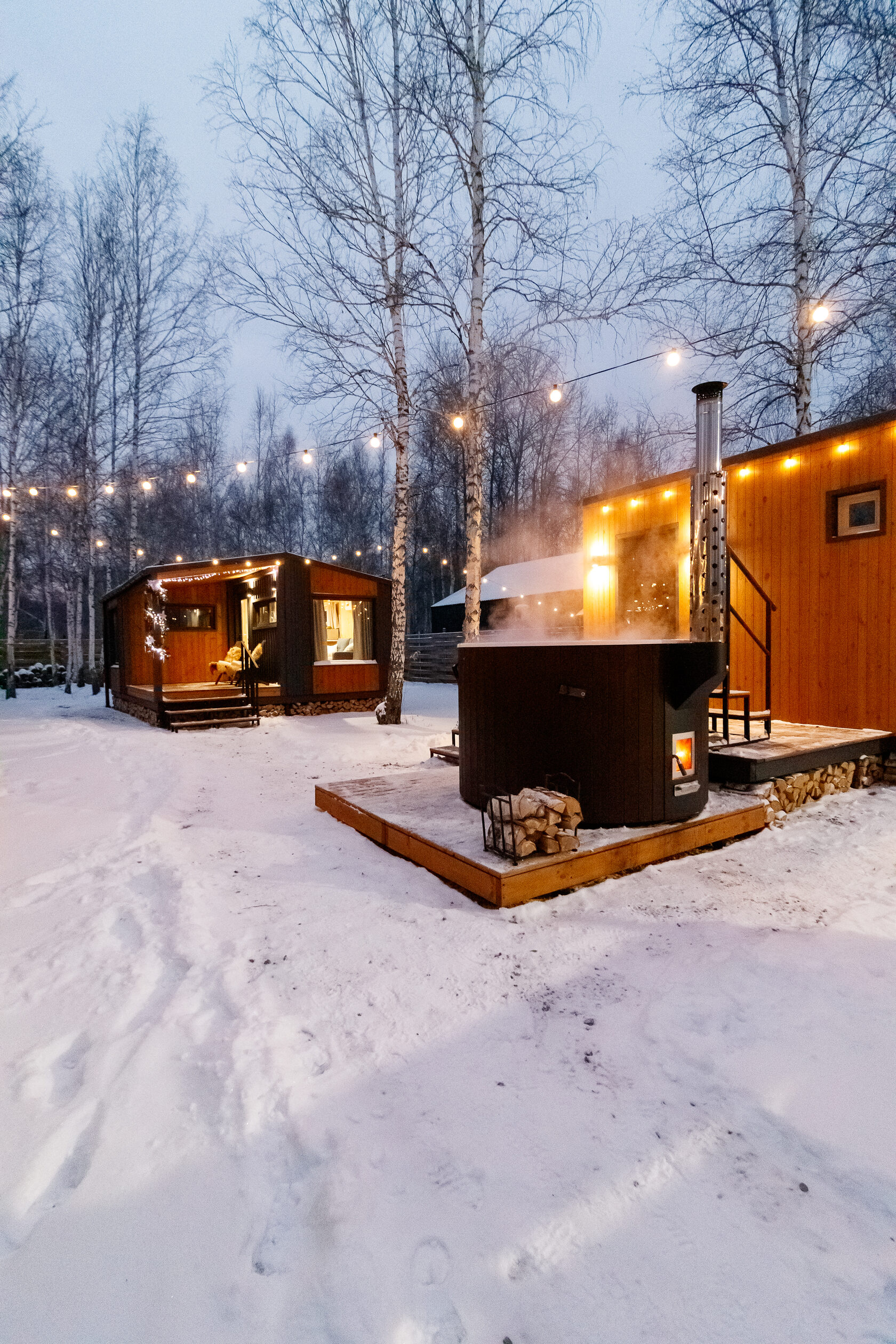 - Чан на дровах: Расположен на улице, под звездами. Это деревянная или металлическая ванна с подогревом, где вода нагревается до 40-45°C. В Тюмени такие чаны популярны для контрастных процедур: из горячей воды — в снег! Фото внешнего вида дома зимой иллюстрирует уют: освещенные гирлянды, дым из трубы и пар от чана среди birch деревьев.