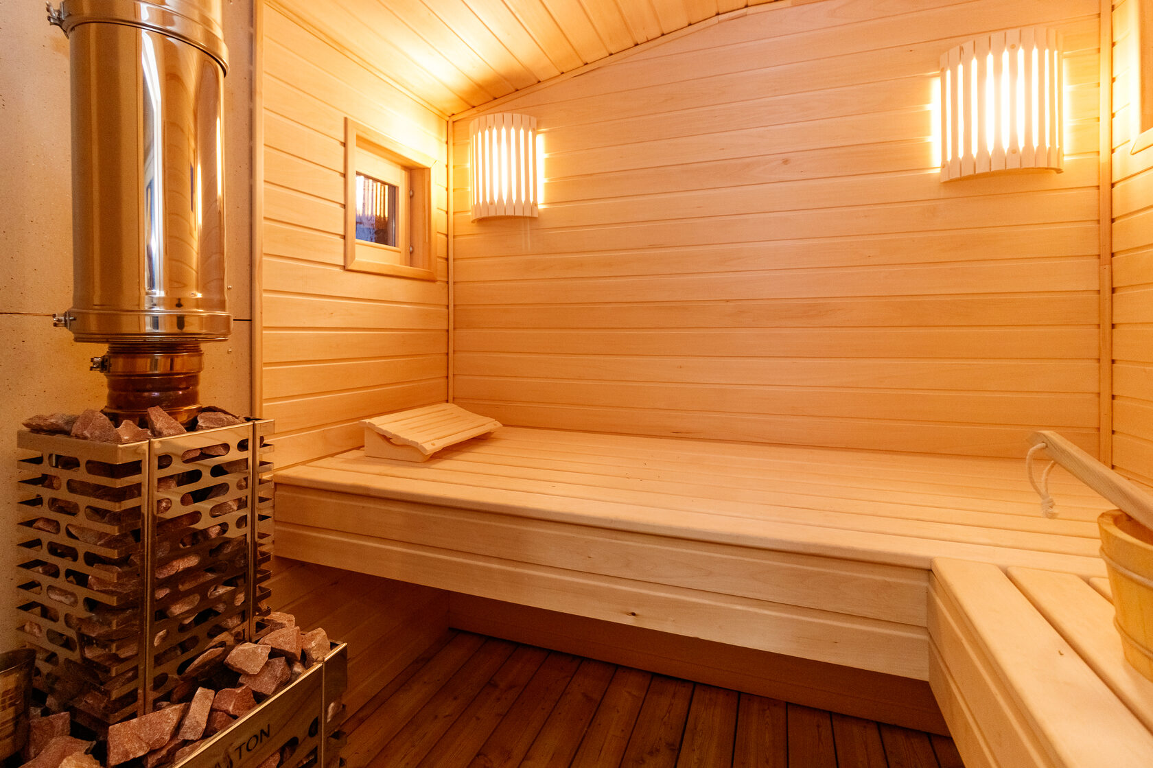 - Баня: Внутренняя отделка из натурального дерева, печь с камнями для пара, полки для лежания и освещение, создающее атмосферу релакса. Фото показывает классическую финскую сауну: деревянные лавки, металлическая печь и ведро для воды. Идеально для сибирских зим — разогреетесь после прогулки по снегу.
