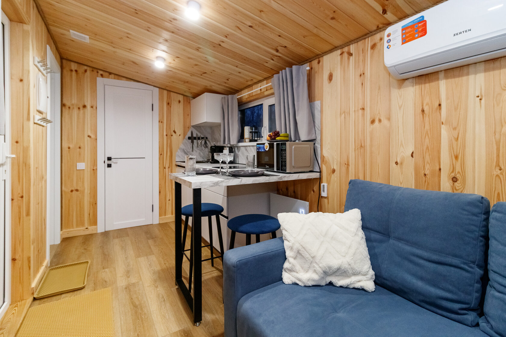 - Кухня-гостиная: Сердце дома — открытая зона с мраморной столешницей, встроенной техникой (микроволновка, кофеварка, электрическая плита) и уютным диваном. Здесь можно готовить ужин, смотреть на лес за окном или принимать гостей. Панорамные окна пропускают максимум света, а деревянная отделка добавляет тепла и стиля. На фото видно, как пространство организовано для максимального комфорта: барная стойка с табуретами, мягкий синий диван с подушками и все необходимое для повседневной жизни.